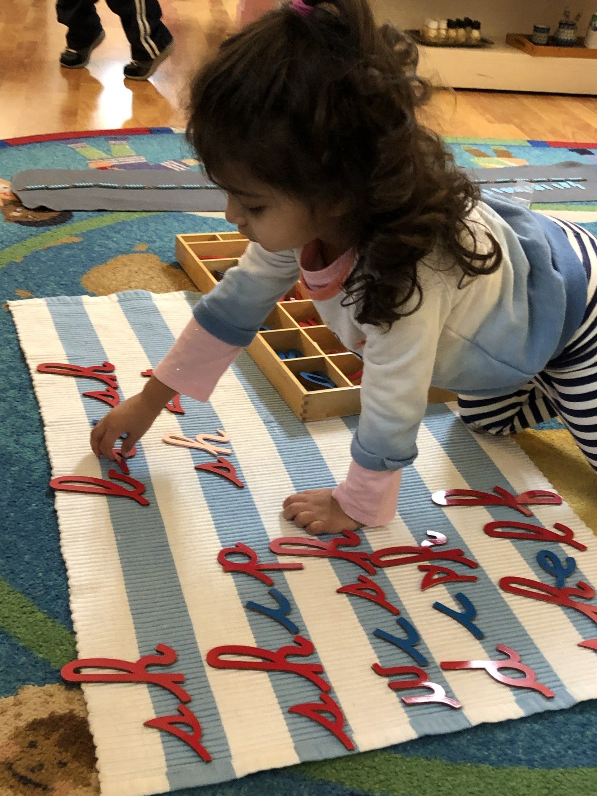 Language exercises begin with a solid foundation in spoken language, which aids the development of vocabulary and phonemic awareness. The development of writing and reading are encouraged, using a variety of tactile and manipulative materials.